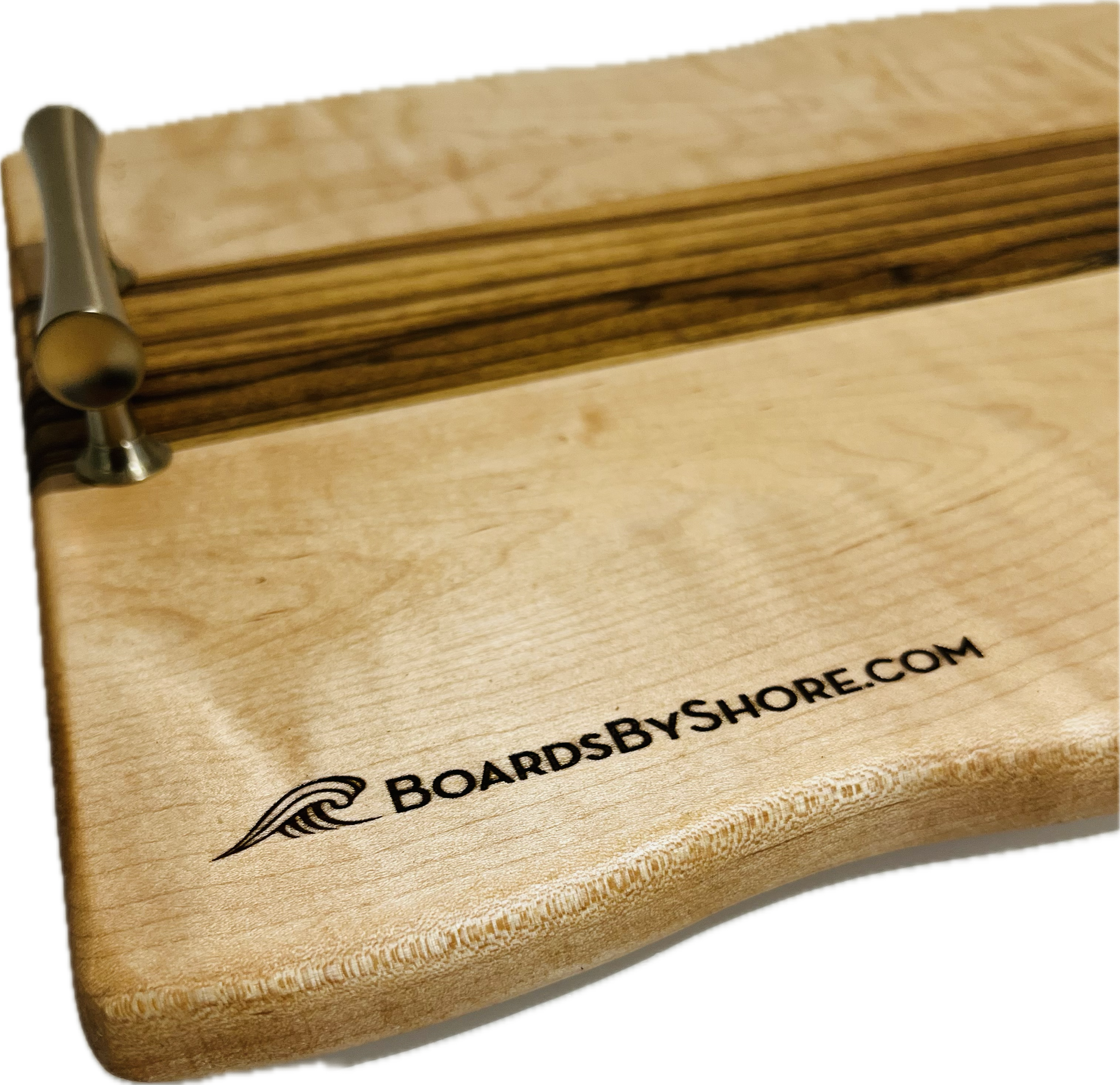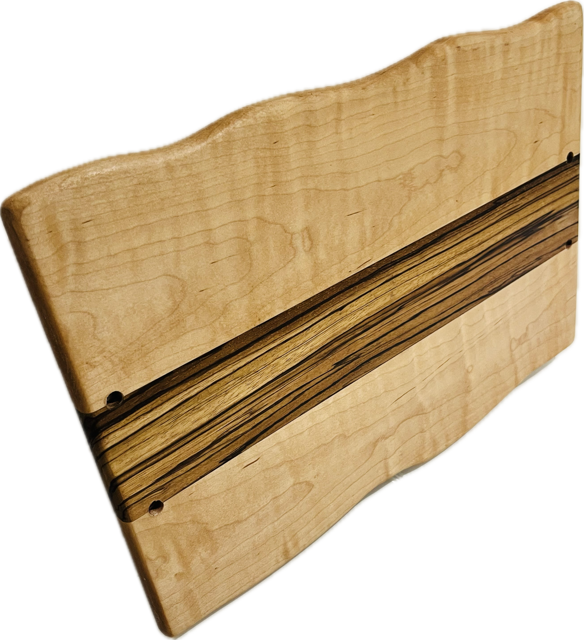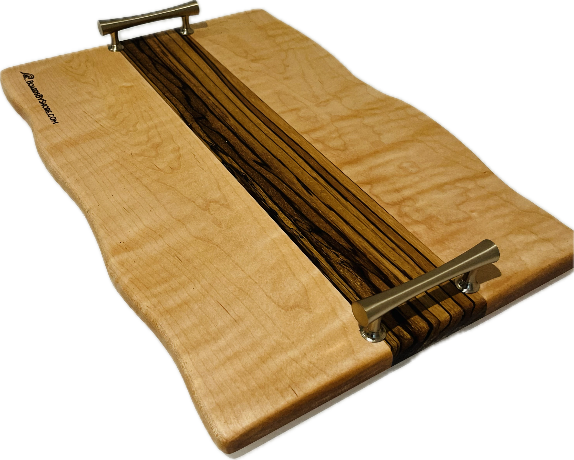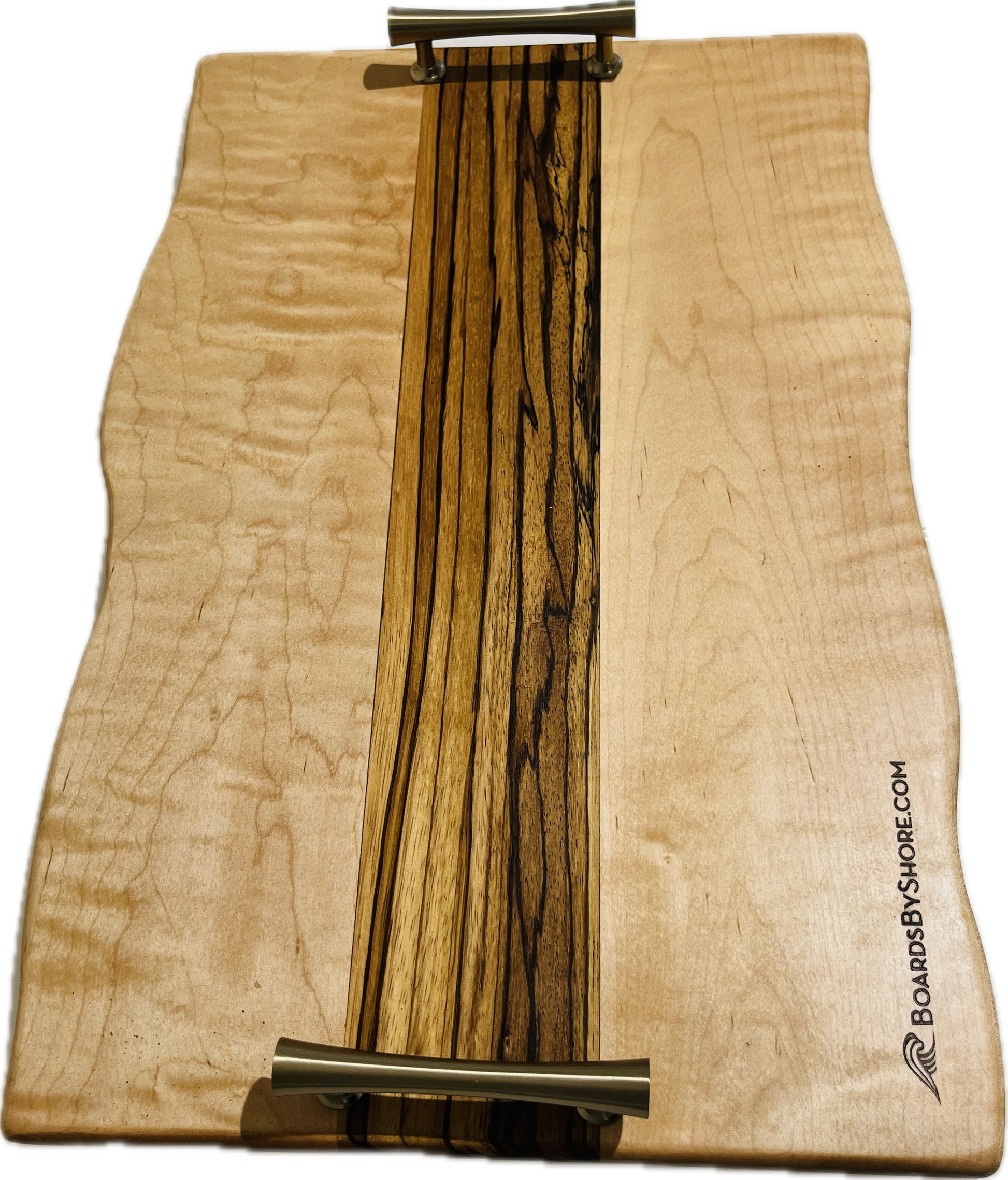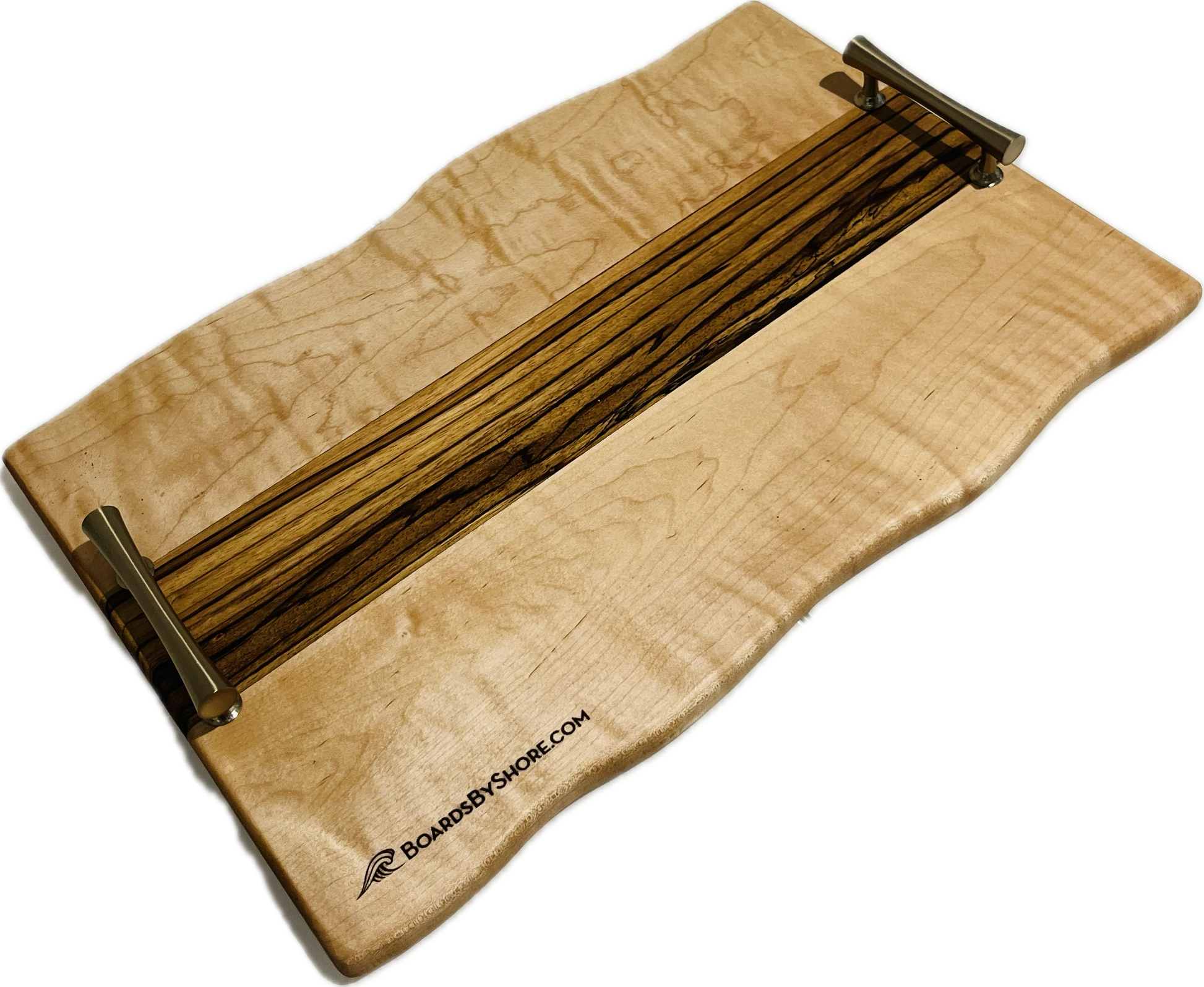 Wow your guests with these eye appealing serving trays made from exotic hardwoods – curly maple with zebrawood middle stripe; semi gloss finish with designer handles and countersunk stainless steel screws.