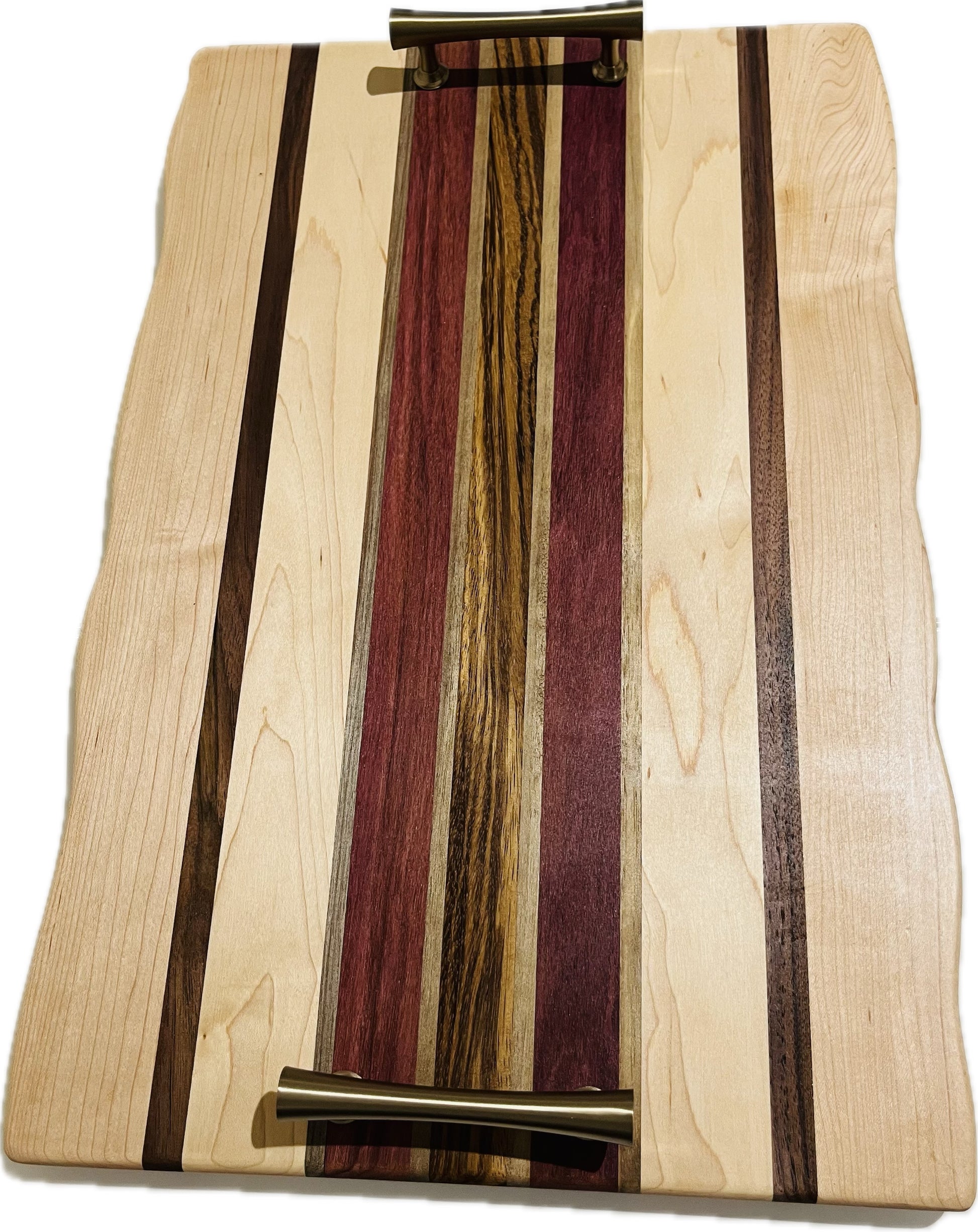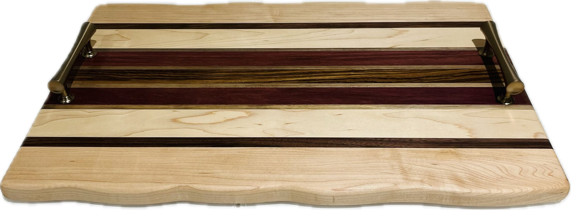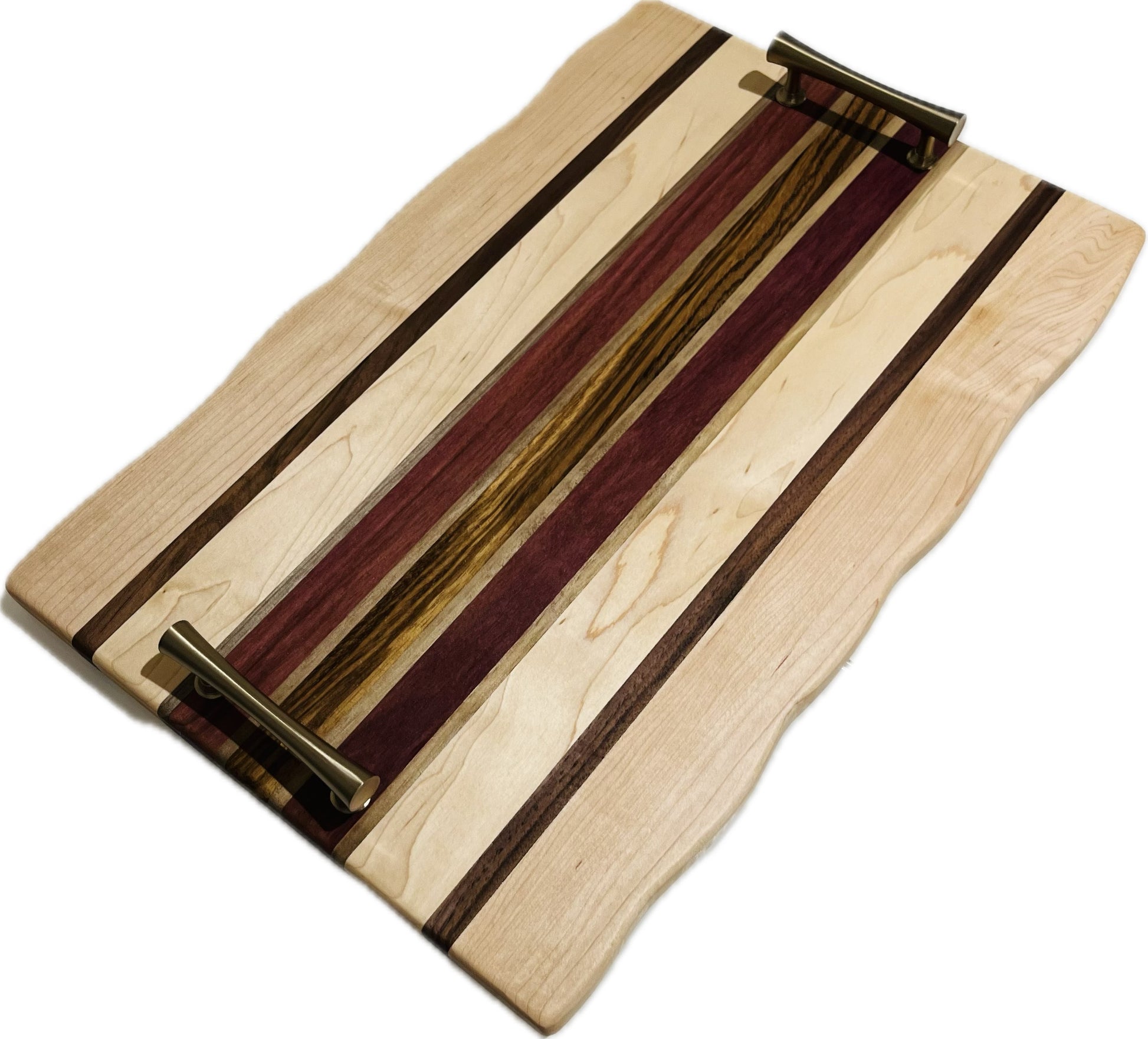 Wow your guests with these eye appealing serving trays made from exotic hardwoods – purpleheart, maple, zebrawood & walnut; semi gloss finish with designer handles and countersunk stainless steel screws.